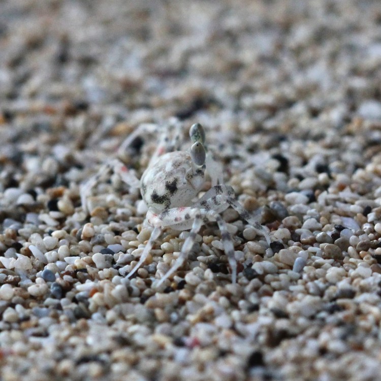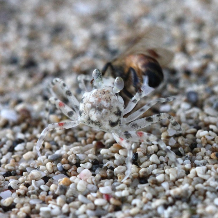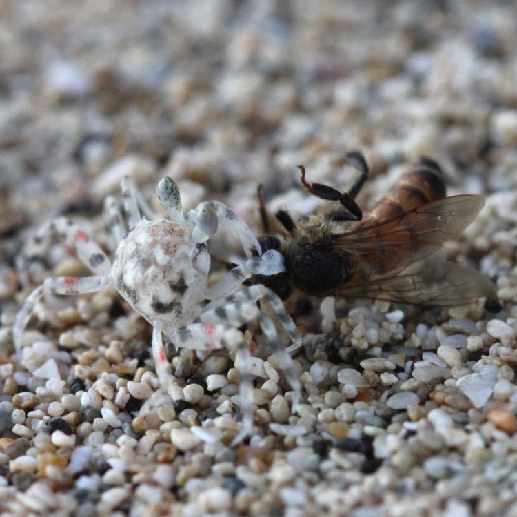 Another day, at the same beach, I noticed a honeybee stumbling about on the sand. I had just gotten my camera ready when a crab suddenly appeared and ambushed the bee. As you can see, the crab’s coloration was an exact match to the particular mix of sand grains that made up this beach. Were it not for the bee, I never would have spotted the crab.