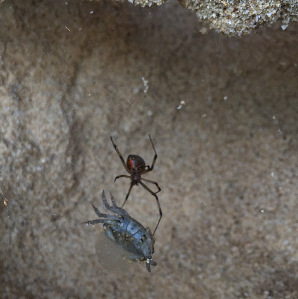 One day, after exploring near the tide pools below Diamond Head, I happened upon a brown widow that had captured a crab in its web and I took this photo with my phone. I’m not sure if this has been documented before, but a search on the internet at the time didn’t turn up any hits. It seems like quite a large meal for a spider, and how exactly does the widow manage to get through the shell?