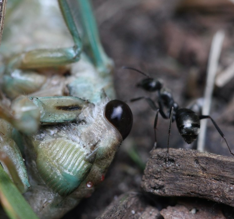 In another instance, this time in Michigan, I happened upon a dying cicada and noticed a couple of ants had also detected the large insect. Soon dozens of ants had arrived, and set about trying to cart off the giant catch.