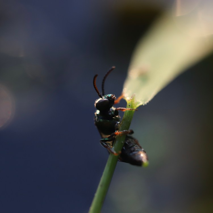 A much smaller insect, and one I haven’t been able to identify, soon followed the sweat bee up the stem. In this photo, it has yet to climb into focus.