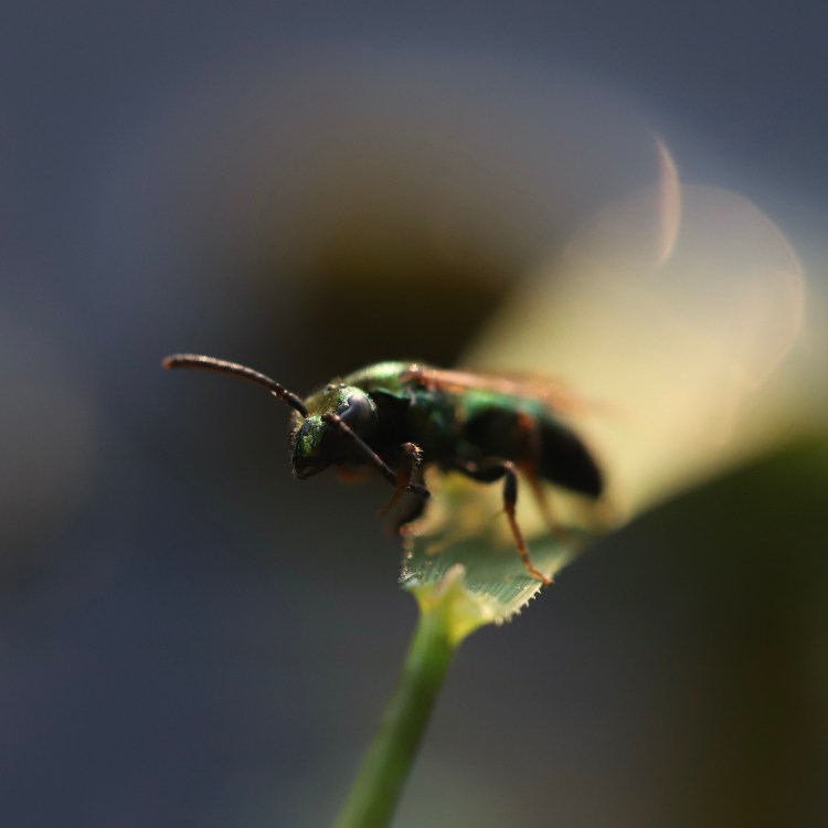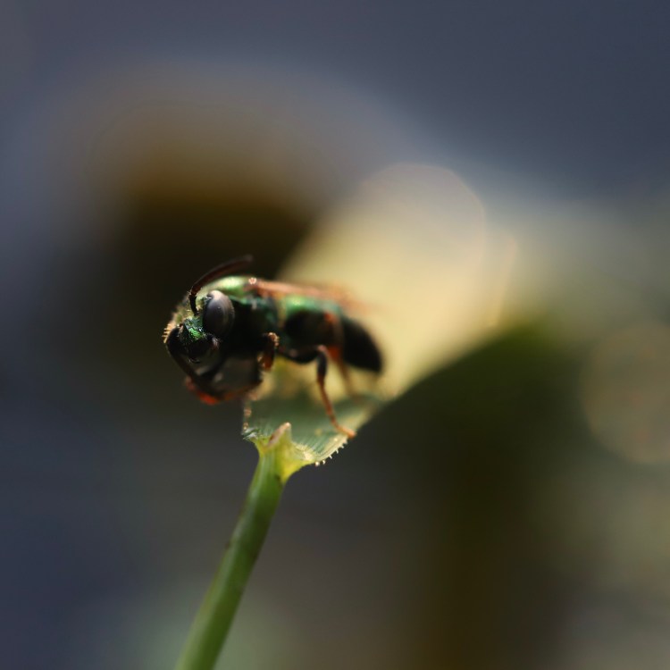 Sometimes the camera captures events that I miss with my own eyes. Along the wavering edge of Asylum Lake in Kalamazoo, MI, I came across a virescent sweat bee, clambering out of the water in the last golden light of the day. As with all of the moments I capture, I can only speculate about the events that preceded and that would follow my observation. How did the bee end up in the water in the first place? Where did it go once I left?