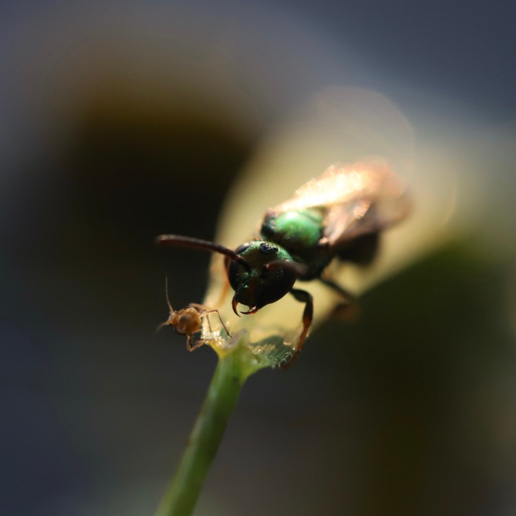 as the smaller insect passes directly beneath the bee’s fierce-looking mandibles, and continues on its way to sunnier climes. It was only in the process of editing my photos that I discovered this secondary plot.